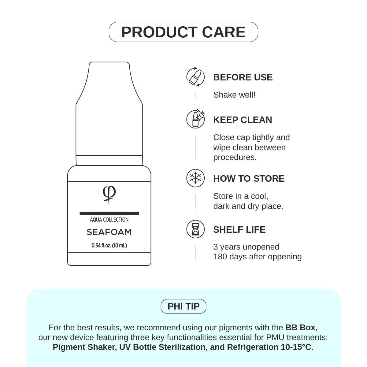 PHI TIP: For best performance, use with the BB Box, providing Pigment Shaker, UV Bottle Sterilization, and Refrigeration 10-15°C below ambient temperature.